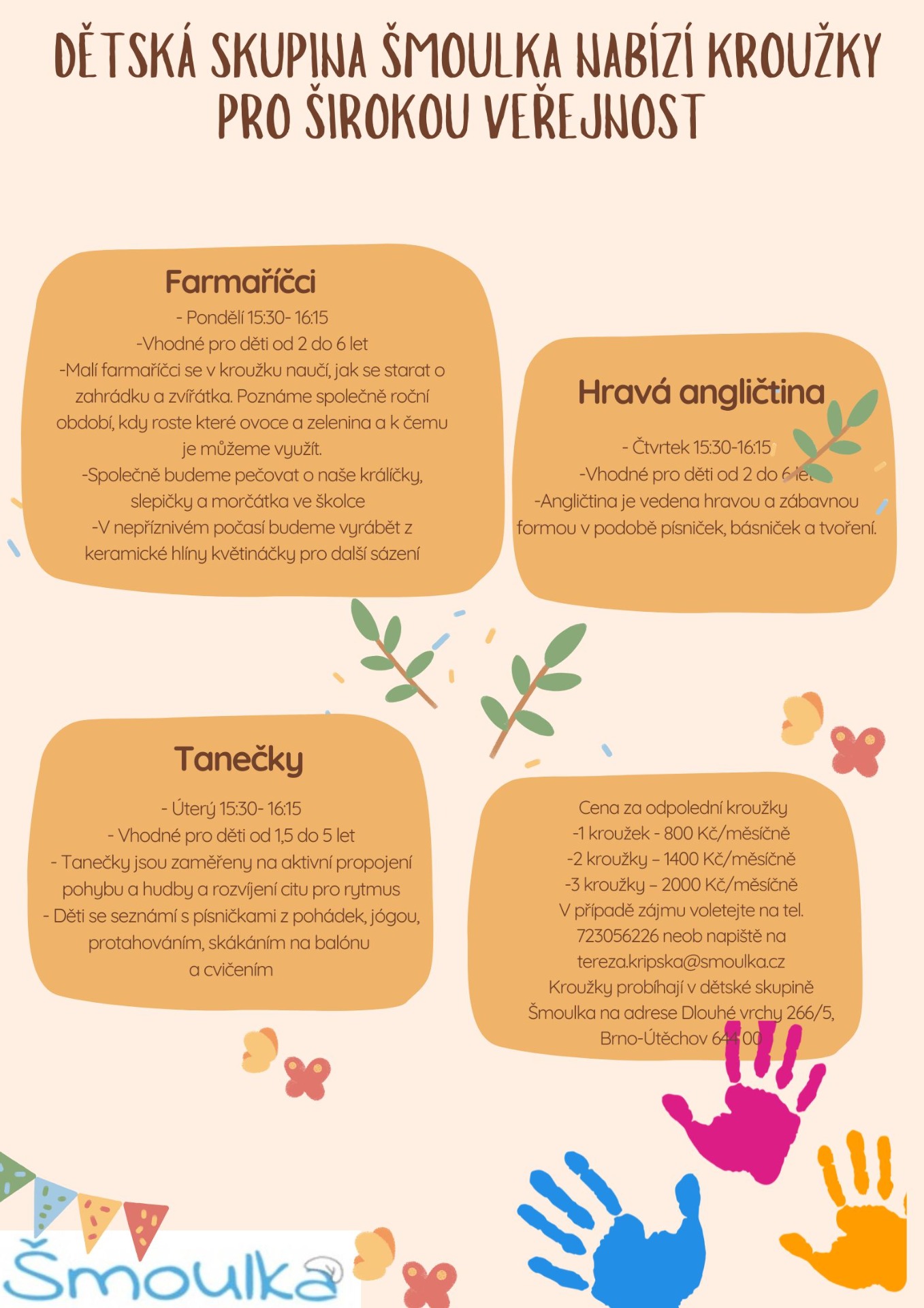 Kromě klasického programu dětské skupiny, jsou pro děti připravené odpolední kroužky. Je možné si zvolit který/které kroužky bude dítě navštěvovat. Kroužky probíhají po provozní době dětské skupiny v čase 15:30-16:15. Cena za odpolední kroužky: